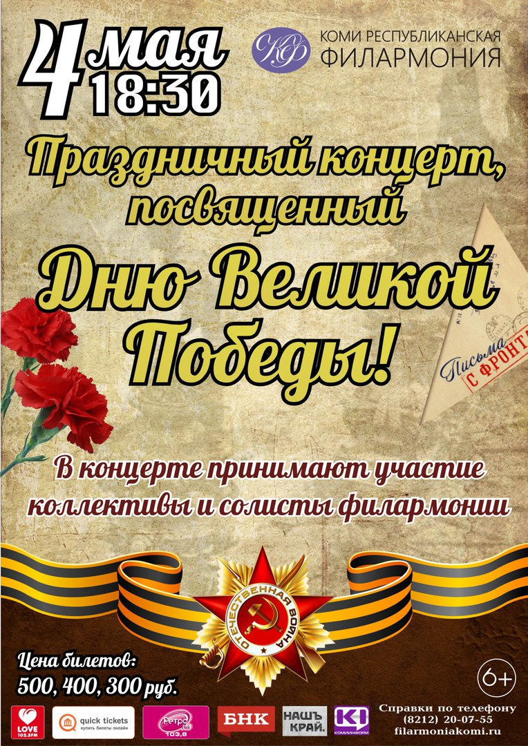 Праздничный концерт, посвященный Дню Великой Победы (6+)4 мая 2017КонцертыВ концерте принимают участие коллективы и солисты филармонии. БилетыСтоимость входного билета: 300-500 рублей «Коми республиканская филармония»: г. Сыктывкар, ул. Ленина, 61. Телефон приёмной: (8212) 20-18-78. Касса: (8212) 20-07-55