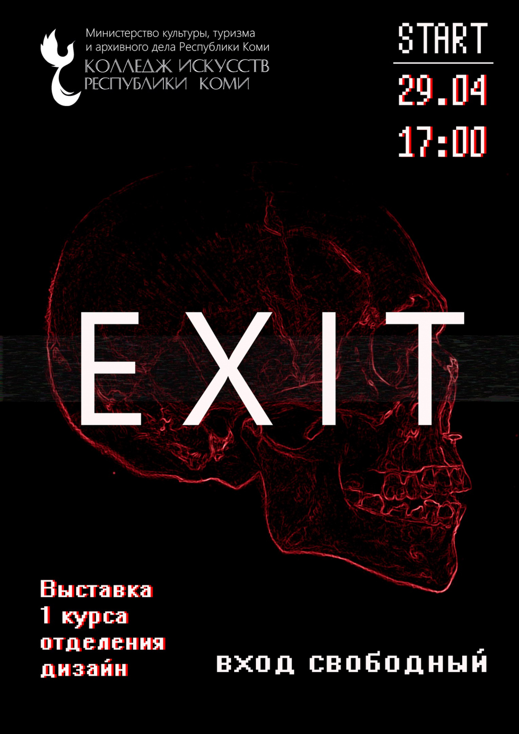 Выставка «EXIT»29 апреля 2017Бесплатно29 апреля пройдет открытие выставки студентов 1 курса отделения «Дизайн» Колледжа Искусств Республики Коми.