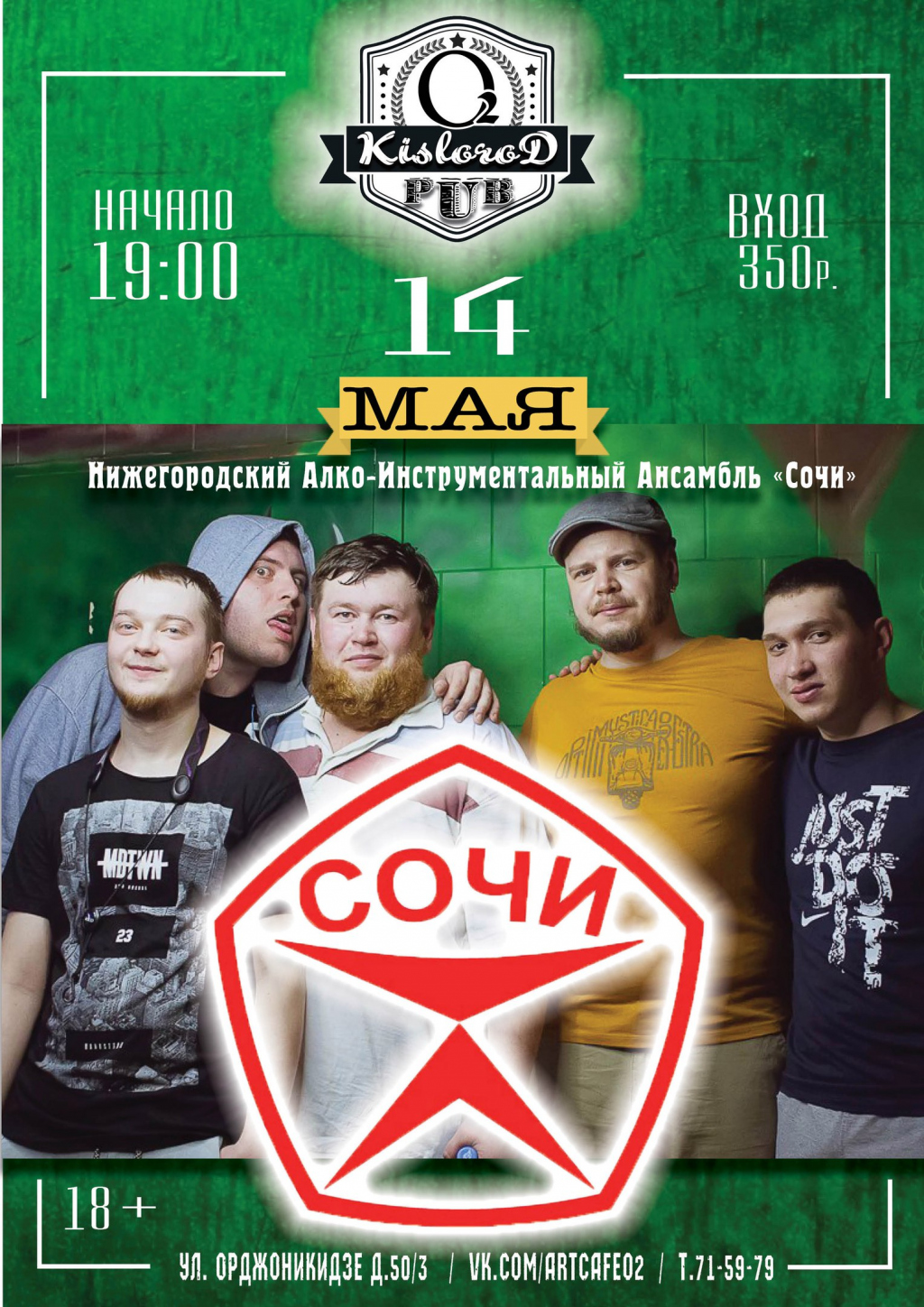«СОЧИ» в пабе «о2»14 мая 2017КонцертыВ Сыктывкар приезжает самая зажигательная ска-группа, веселый нижегородский алко-инструментальный ансамбль «СОЧИ».