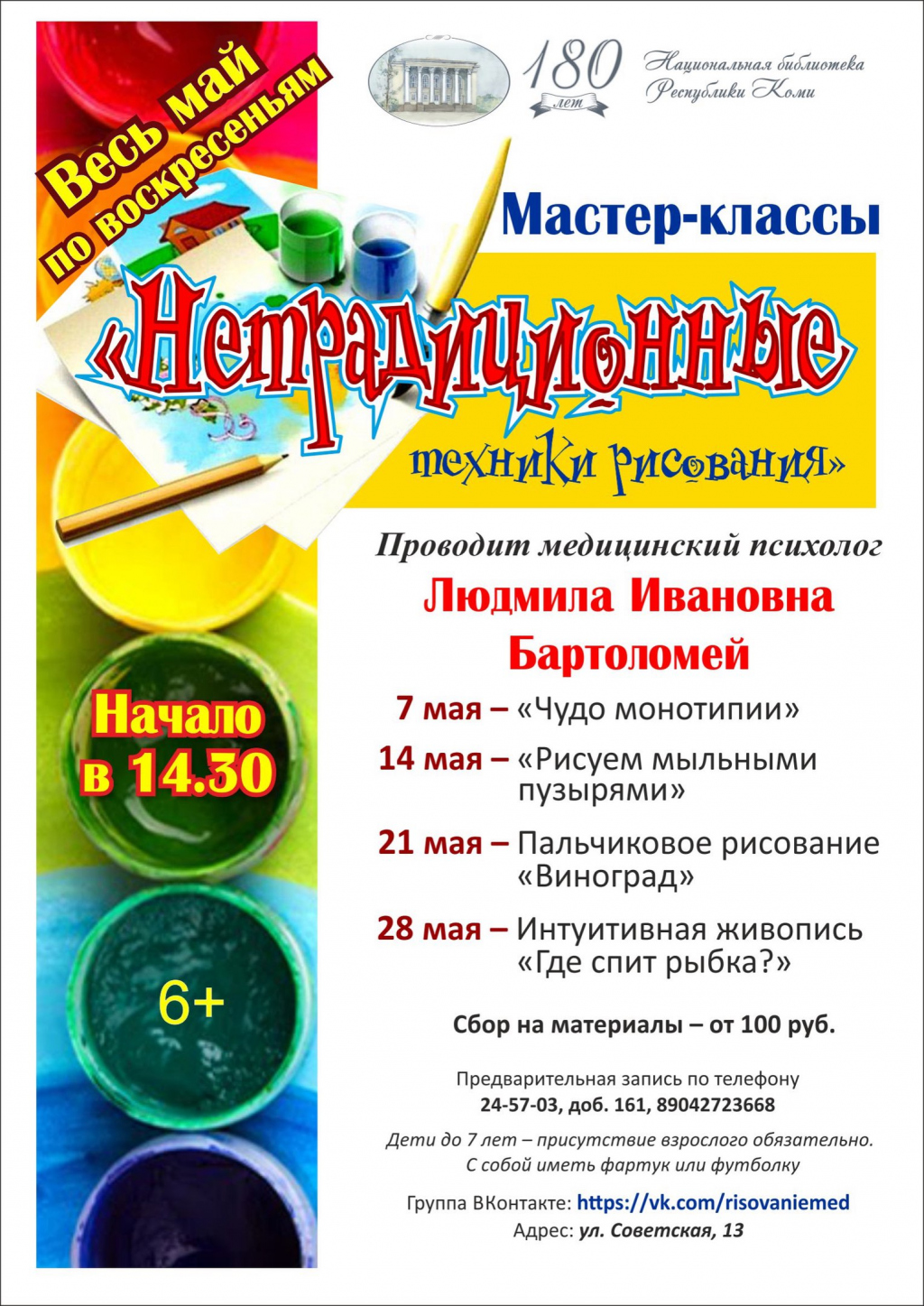 Мастер-классы «Нетрадиционные техники рисования» (6+)14 мая 2017Мастер-классыМастер-классы проводит медицинский психолог Людмила Бартоломей