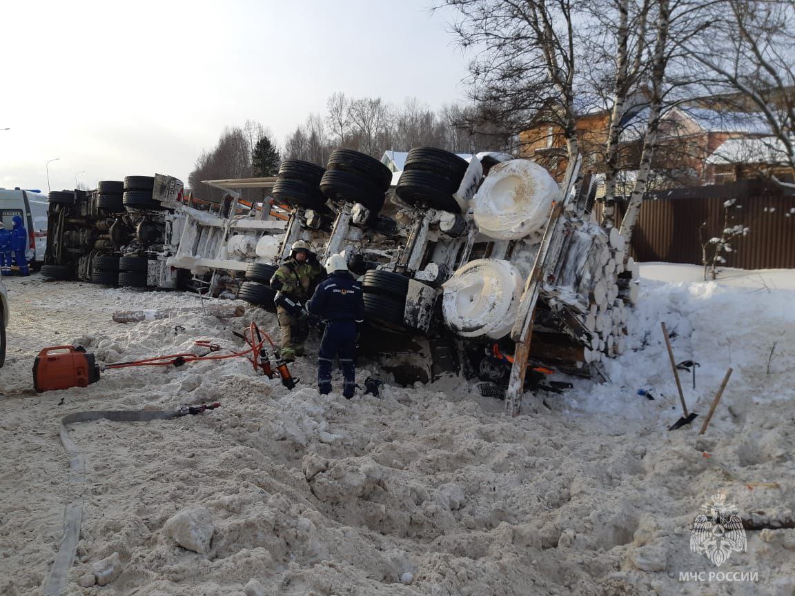 Оказалось, что для вызволения людей, машину пришлось резать с низа кузова. Во время ДТП, когда полуприцеп лесовоза упал на автомобиль, он развернул под собой машину на бок.