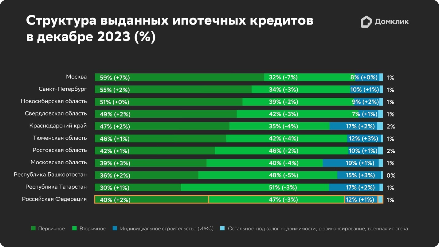 Если не считать рекорда в сентябре 2023 года, в декабре 2023-го спрос на первичном рынке достиг самого высокого значения за всю историю наблюдений: выдано 49,9 тысяч жилищных кредитов (+6,8% с ноября). Доля первичного жилья в общем объеме выдач выросла до рекордных 39,7%. Столь высокие значения вызваны резким увеличением спроса перед ужесточением условий льготных ипотек, а именно: