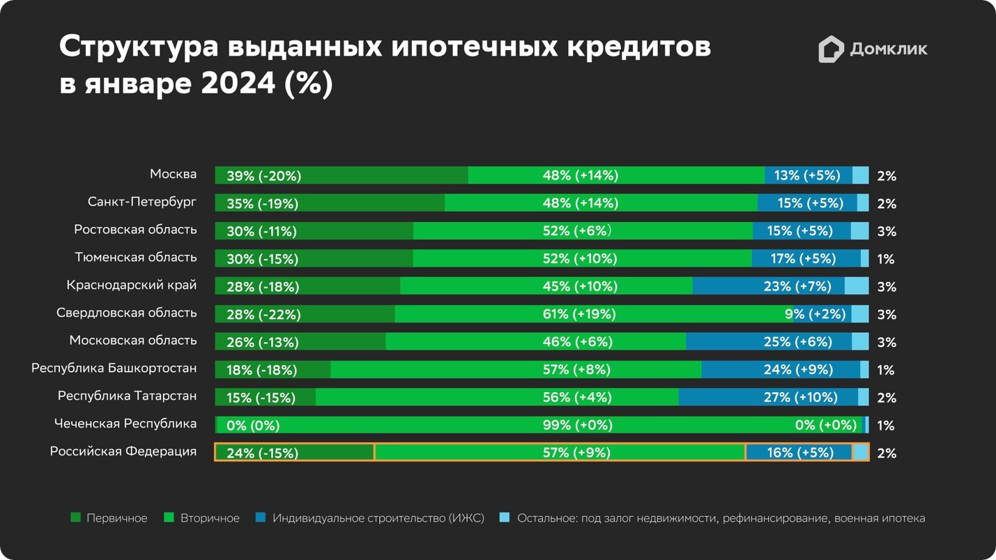 В январе, несмотря на продолжающееся снижение числа выдач, доля вторичного рынка выросла до 56,7% (+9,4%). Это произошло из-за сокращения спроса на строящееся жилье в силу ужесточения условий льготной ипотеки.
