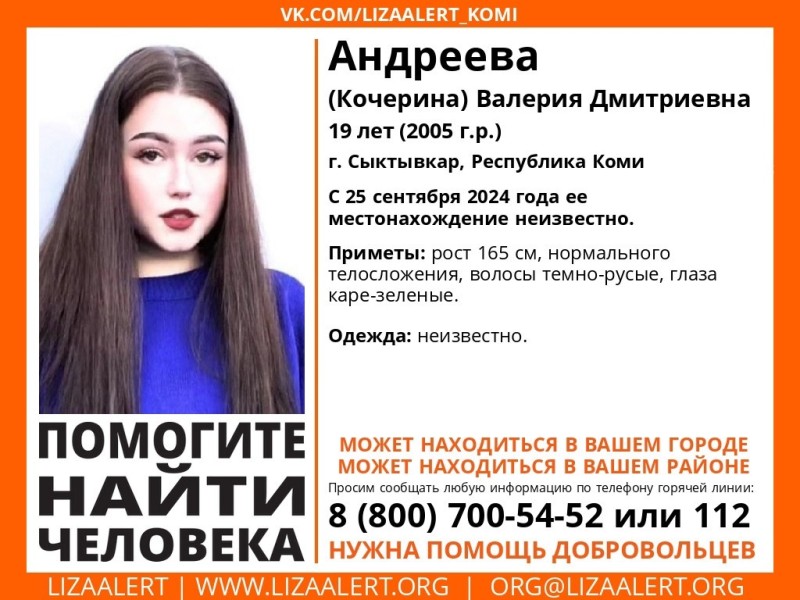 В Сыктывкаре разыскивается девушка, исчезнувшая около месяца назад. Согласно информации от поисковой группы "Лиза Алерт", 19-летняя Валерия Андреева (Кочергина) пропала 25 сентября.