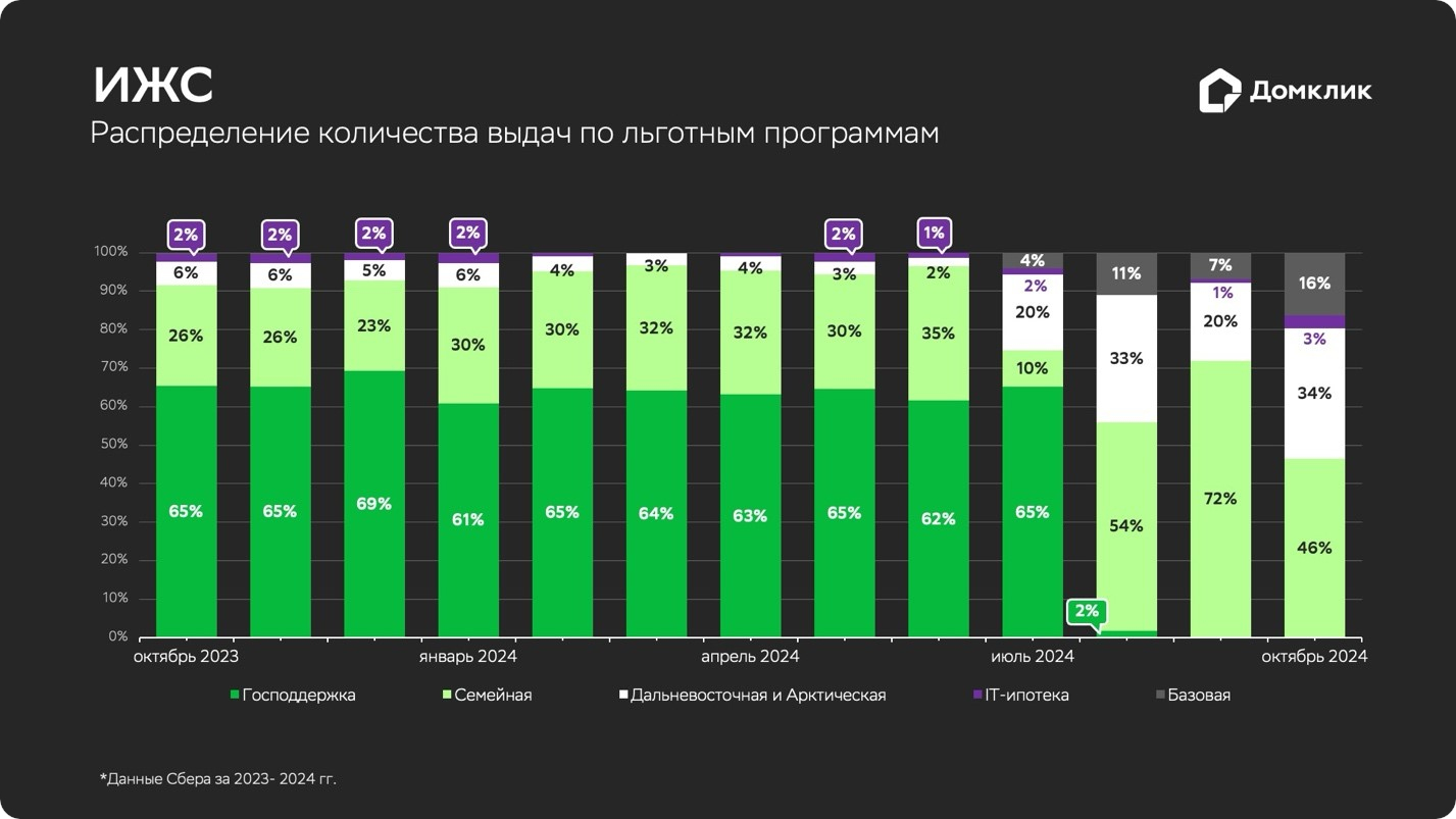 После завершения программы "Господдержка" и введения обязательного требования об использовании счетов эскроу при оформлении кредита по "Семейной ипотеке" спрос на данный тип недвижимости существенно сократился. В третьем квартале количество выдач составляет около двух тысяч сделок в месяц — примерный уровень 2022 года. Доля льготной ипотеки также заметно снизилась: по данным третьего квартала, около 7% сделок в сегменте ИЖС заключаются на рыночных условиях. Учитывая статистику за неполный октябрь, можно предположить, что доля рыночной ипотеки в ближайшее время снижаться не будет.