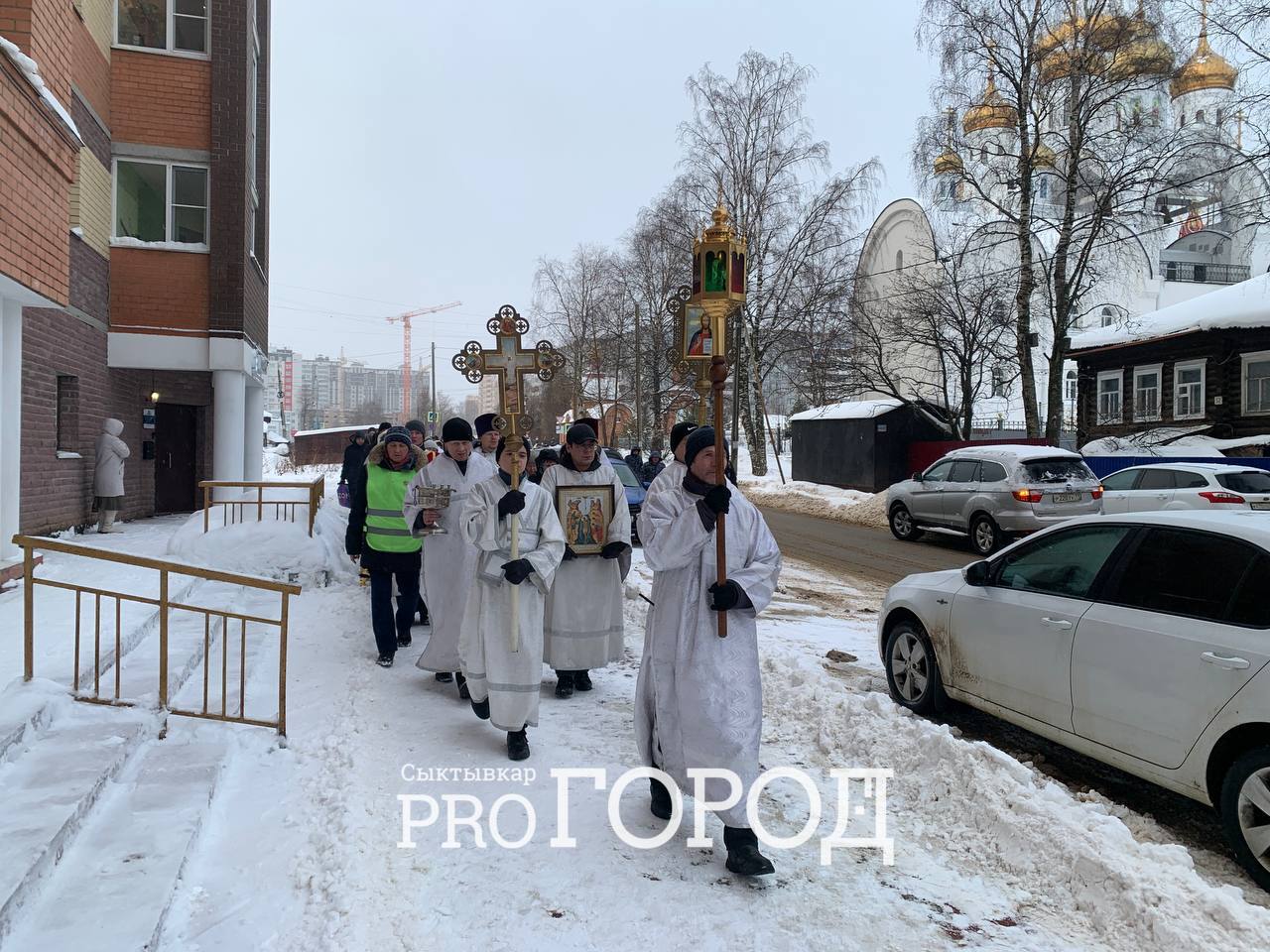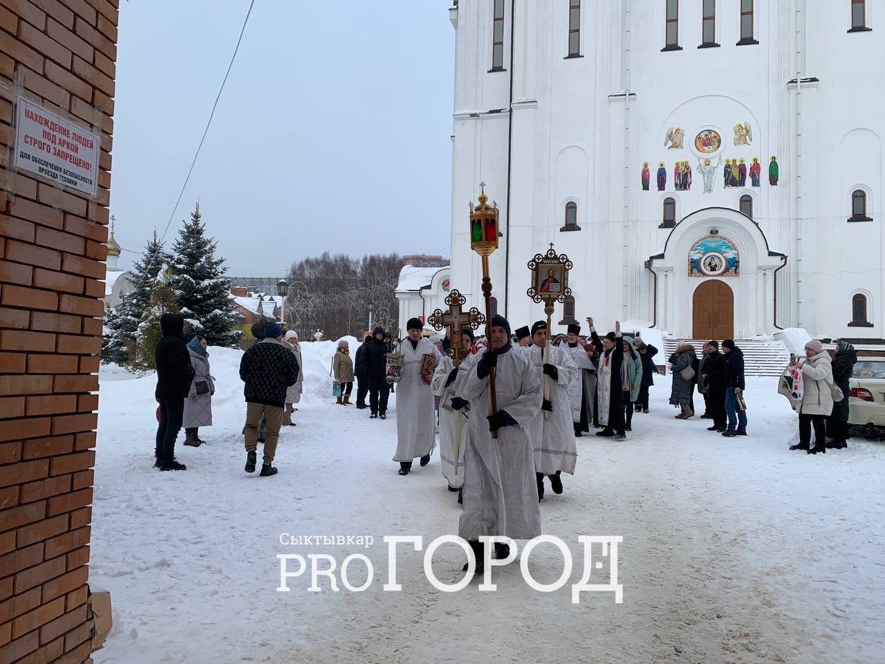 В районе 11:30 на улице, возле входа в храм, священнослужители собрались вместе с верующими для организации крестного хода. Через 20 минут они отправились по улице Свободы к правому берегу реки Сысола.