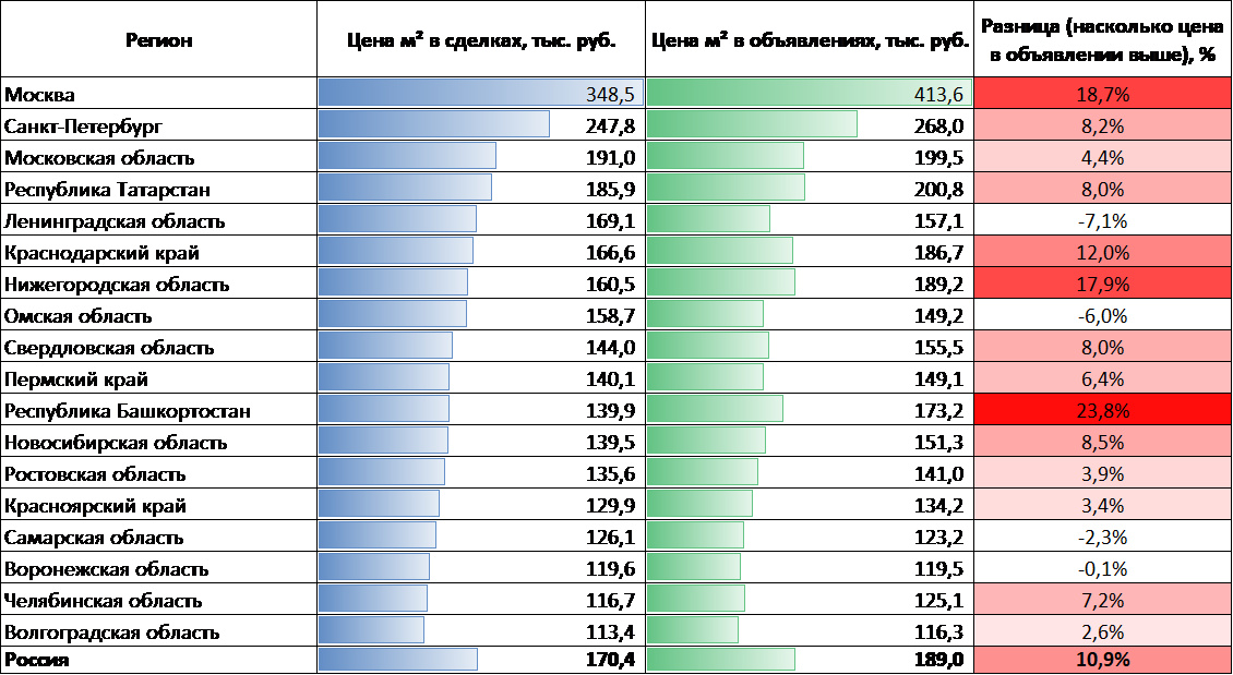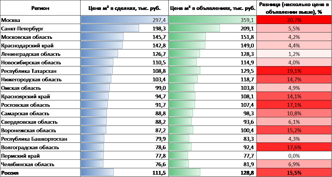 Сравнение данных Центра финансовой аналитики (ЦФА) и Домклик показало, что в декабре различие между ценой квадратного метра в сделках и объявлениях на первичном рынке РФ составило 10,9%. Причем в ряде крупнейших субъектов разница гораздо более значительная. Так, в Республике Башкортостан разница между ценой предложения и спроса составила 23,8%, в Москве — 18,7%, Нижегородской области — 17,9%, в Краснодарском крае — 12%.