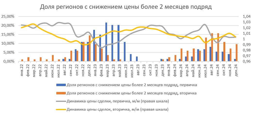 Еще одним признаком возможного скорого снижения цен на вторичном рынке служит рост доли регионов с падением цен на протяжении последних трех и более месяцев подряд. При этом в октябре и ноябре этот показатель падал.