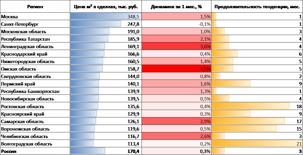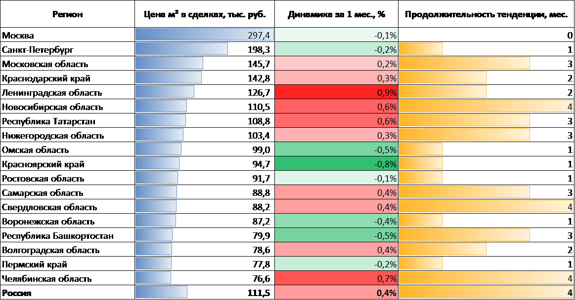 Наиболее выраженный прирост стоимости квадратного метра отмечен в Ленинградской (+0,9%), Челябинской (+0,7%), Новосибирской (+0,6%) областях, а также в Республике Татарстан (0,6%). Притом тенденция роста является относительно устойчивой лишь для Челябинской и Новосибирской областей: увеличение стоимости квадратного метра фиксируется в течение последних четырех месяцев.