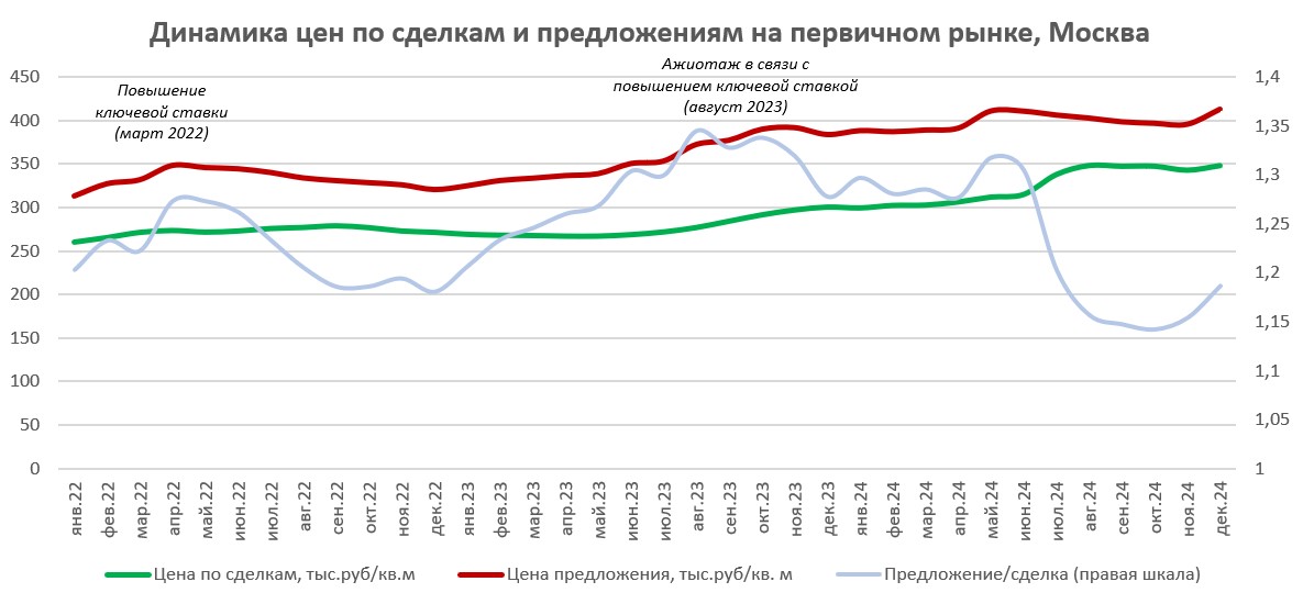 В Москве после длительного периода сокращения разрыва между ценами предложения и сделки в ноябре–декабре произошел разворот тенденции, что в итоге привело к росту цен в последний месяц года.