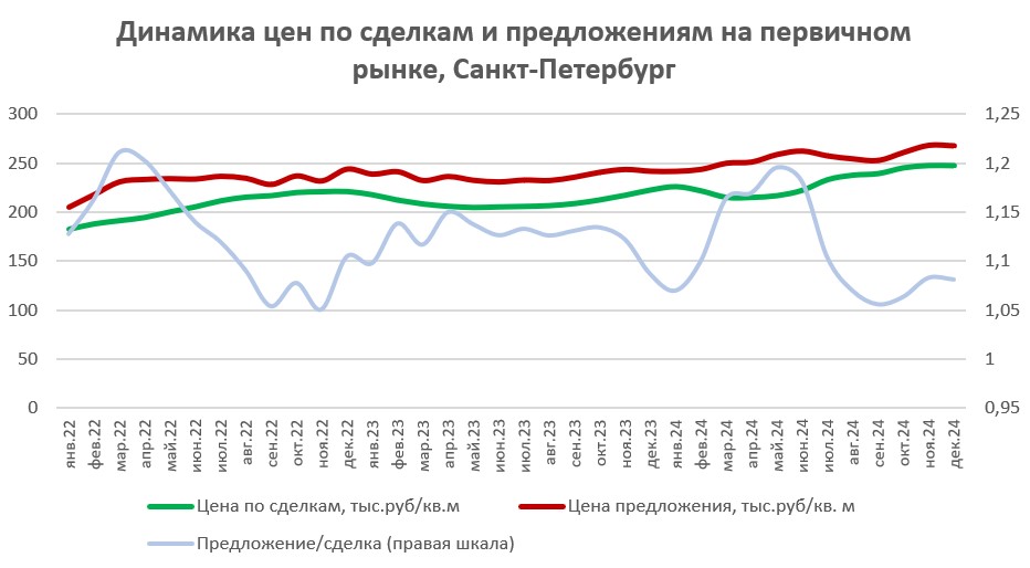 В Петербурге по итогам ноября тоже начинал расти разрыв между ценами предложения и сделки, однако в декабре этот показатель стал сокращаться, и цена метра по фактическим сделкам, поднявшись в ноябре, потом снова снизилась.