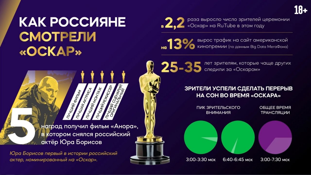 Номинация Юры Борисова на кинопремию «Оскар» за роль второго плана в фильме «Анора» (18+) ожидаемо вызвала повышенный интерес россиян к церемонии вручения премии. В ночь на 3 марта за онлайн-трансляцией из театра Dolby в Лос-Анджелесе следили в два раза больше зрителей, чем годом ранее. К таким выводам пришли аналитики МегаФона и видеохостинга Rutube, проводившего прямую трансляцию мероприятия.
