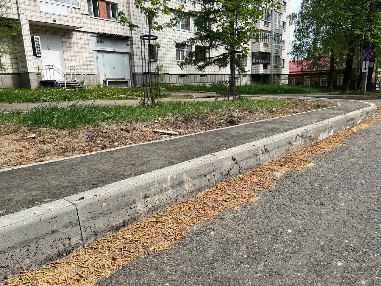 Проезжая часть от пешеходной отделена новыми бордюрными камнями. Между зонами для пешеходов и транспорта остались линии озеленения, где будет засеян новый травяной газон. Что касается деревьев: здесь все они сохранены, поскольку корневая система тополей не мешала проведению работ.