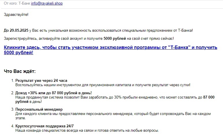 В тексте письма указано, что "до 29.05.2025 у вас есть уникальная возможность воспользоваться специальным предложением от Т-Банка". Анонимы, маскирующиеся под известное финансово-кредитное учреждение, предлагают "зарегистрироваться, активировать свой аккаунт и получить 5000 рублей на свой счет прямо сейчас". После этого предложения следует гипер-ссылка с призывом: "Кликните здесь, чтобы стать участником эксклюзивной программы от "Т-Банка" и получить 5000 рублей!".