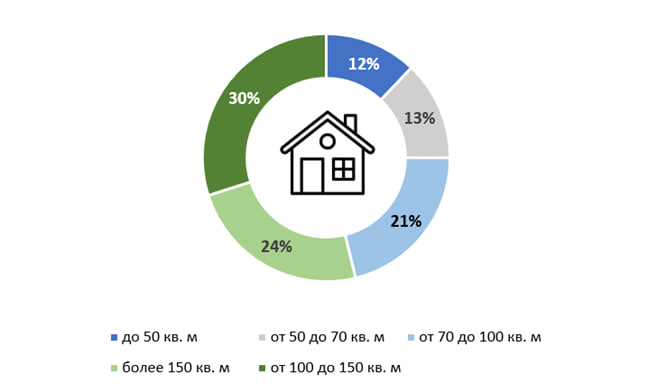 На рынке загородной недвижимости преобладают дома площадью от 100 до 150 кв. м (30%) и свыше 150 кв. м (24%). Ещё 21% приходится на дома с площадью от 70 до 100 кв. м. Доля домов в пределах от 50 до 70 кв. м составляет 13%, а совсем небольших домиков и коттеджей – 12%.