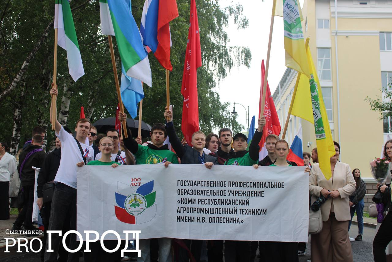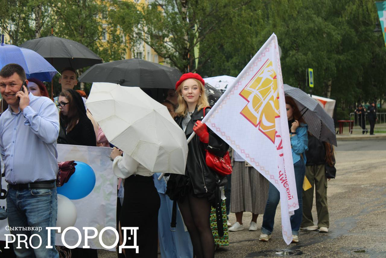 Сегодня в Сыктывкаре погода не радует горожан – несмотря на тепло, периодически льет дождь. Однако это не помешало студентам Коми принять участие в торжественном шествии.