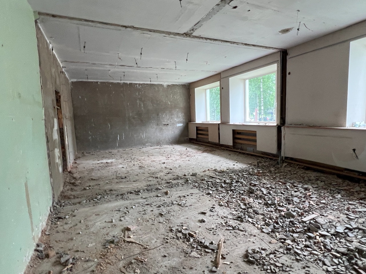 Сейчас большая переделка охватывает два этажа: готовность первого (порядка тысячи квадратных метров) пока 40 процентов, а второго (около 380 «квадратов») – уже 80 процентов. Закончена перепланировка. Снято старое покрытие с полов, стен и потолков. Ведется замена инженерных систем. Бригада укладывает новые полы, параллельно штукатурит стены и устанавливает подвесные потолки. Часть стеклопакетов оставят – те, что в хорошем состоянии. Об этом руководителю администрации Владимиру Голдину доложил представитель подрядчика.