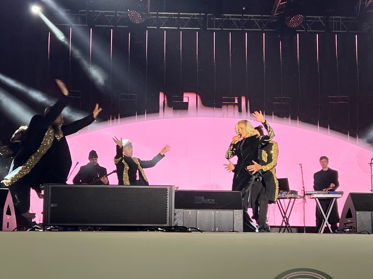 Певица приехала со своими музыкантами. Живой аккомпанемент обеспечили двое гитаристов, клавишник и барабанщик. А эстетики музыкальным номерам добавила мужская балетная труппа.