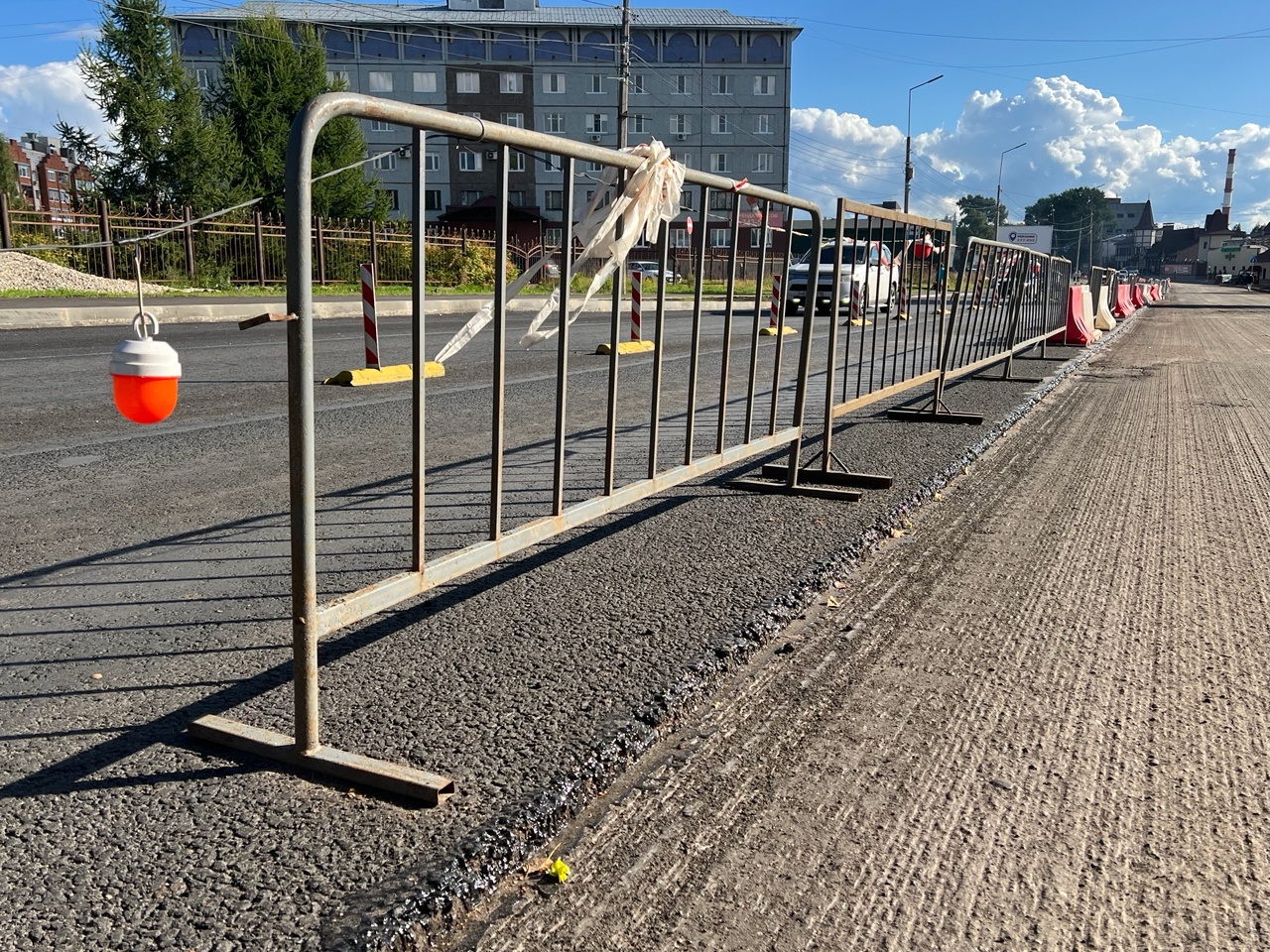 Что касается самой дороги: на одной половине проезжей части укладка асфальтобетона завершена, а на другой – как раз ведется в данный момент. Подрядчик надежный. Темп его работ заказчик оценивает как хороший.