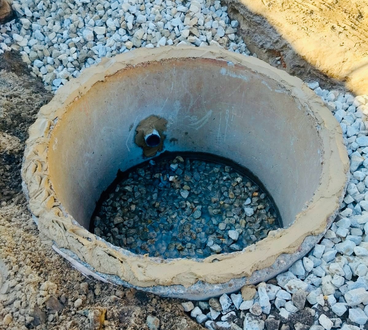 Теперь сверху колодец закрывается крышкой. С двух сторон к нему подведены дренажные трубы длиной около 6 метров. В них предусмотрены отверстия для точечного сбора ливневых поверхностных вод из дренажных каналов. На дно каналов засыпан песок, на него застелен геотекстиль, засыпан щебень, на который уложена дренажная труба, затем снова слой фильтрационной щебня и геоткань внахлест насыпи щебня.