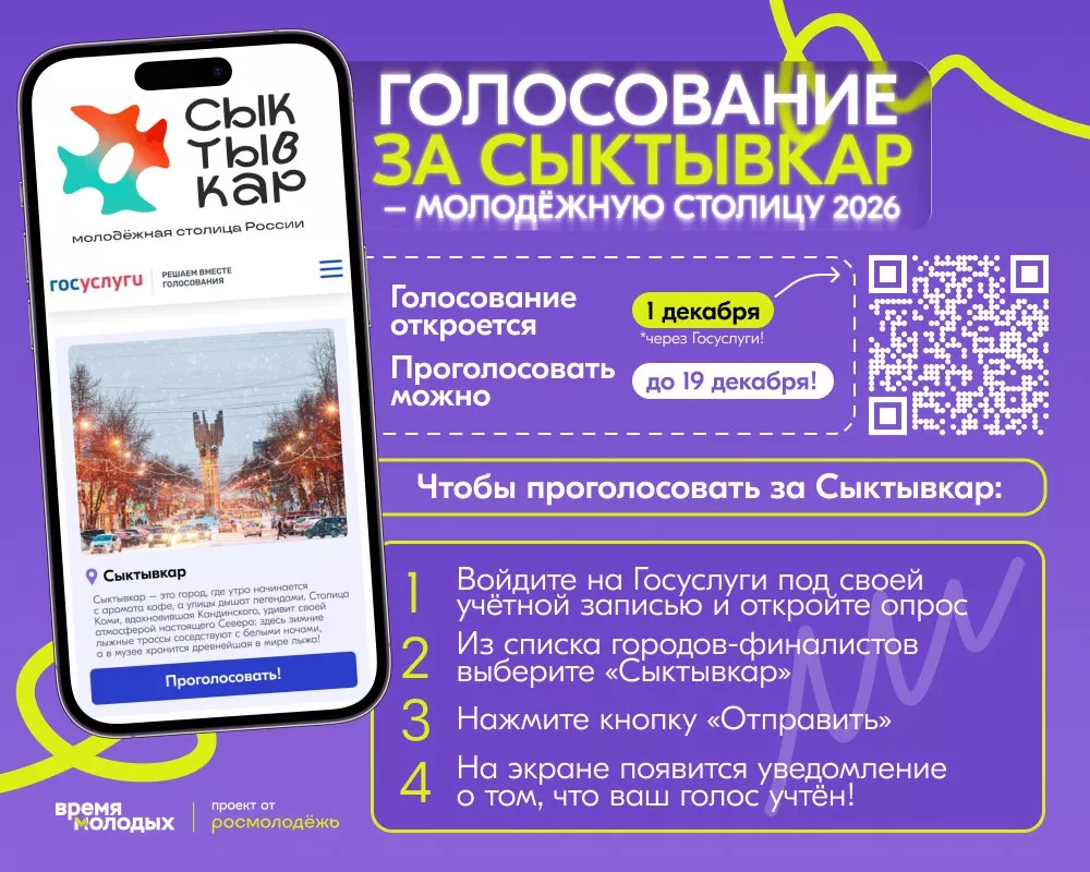 С 1 по 19 декабря на портале Госуслуг проходит голосование, определяющее победителя конкурса "Молодежная столица России - 2026". Сыктывкар, наряду с Вологдой, Салехардом, Смоленском, Томском и Челябинском, вошел в финальную шестерку претендентов.