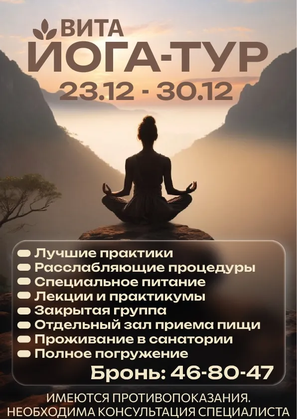 Санаторий "ВИТА" запускает уникальную программу восстановления — йога-тур "Антистресс", который пройдёт с 23 по 30 декабря. Это камерный формат для тех, кто хочет завершить год в осознанном спокойствии, снять напряжение и наполниться силами перед новым стартом.