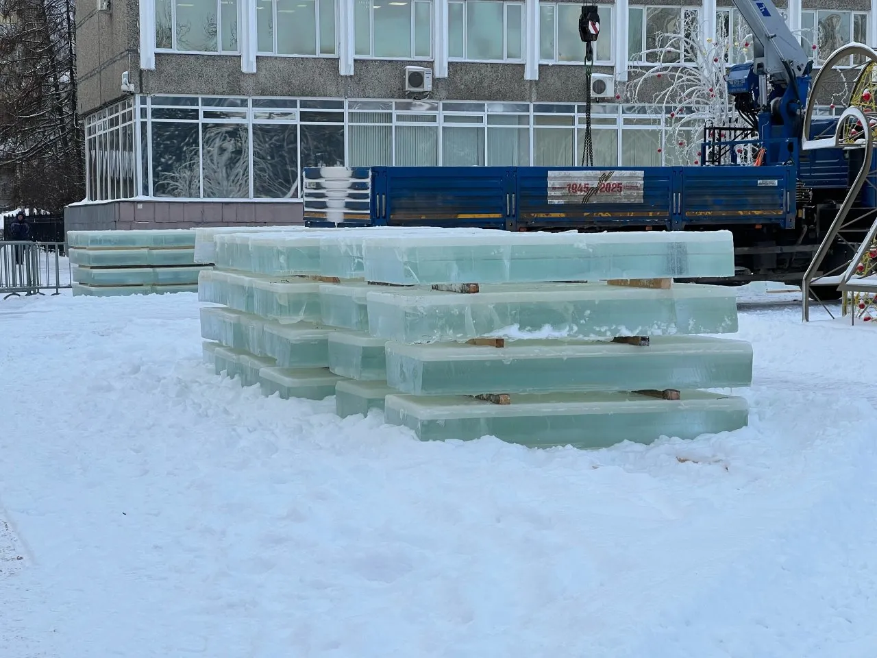 К данному моменту свыше десятка ледяных плит уложены в стопки на территории площади. Когда весь необходимый обьем этого «стройматериала» будет доставлен - к важной миссии приступят специалисты по оформлению ледяного городка. Какими окажутся фигуры и что они будут изображать - пока держится в секрете. Известно только, что все ледяные арт-объекты будут отвечать концепции благоустройства «Легенды Севера».