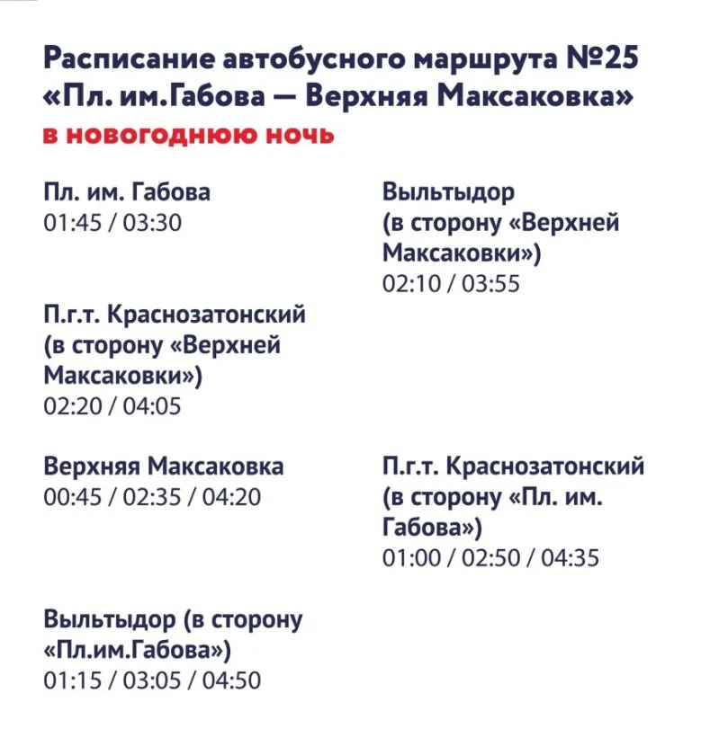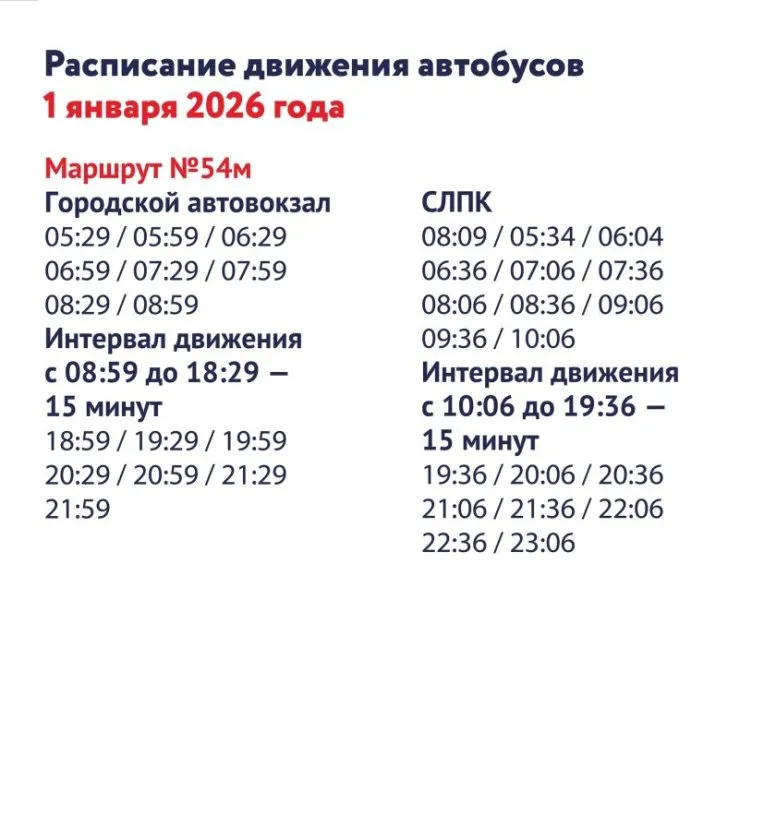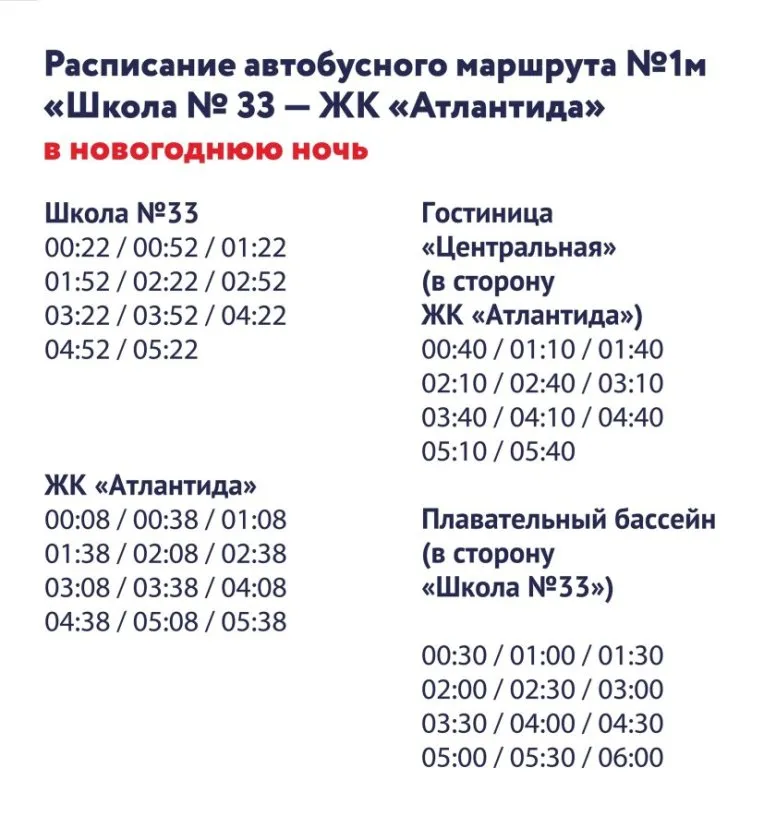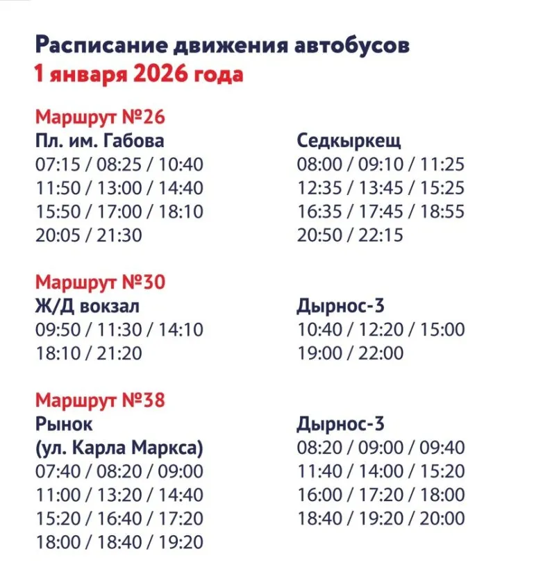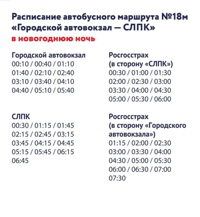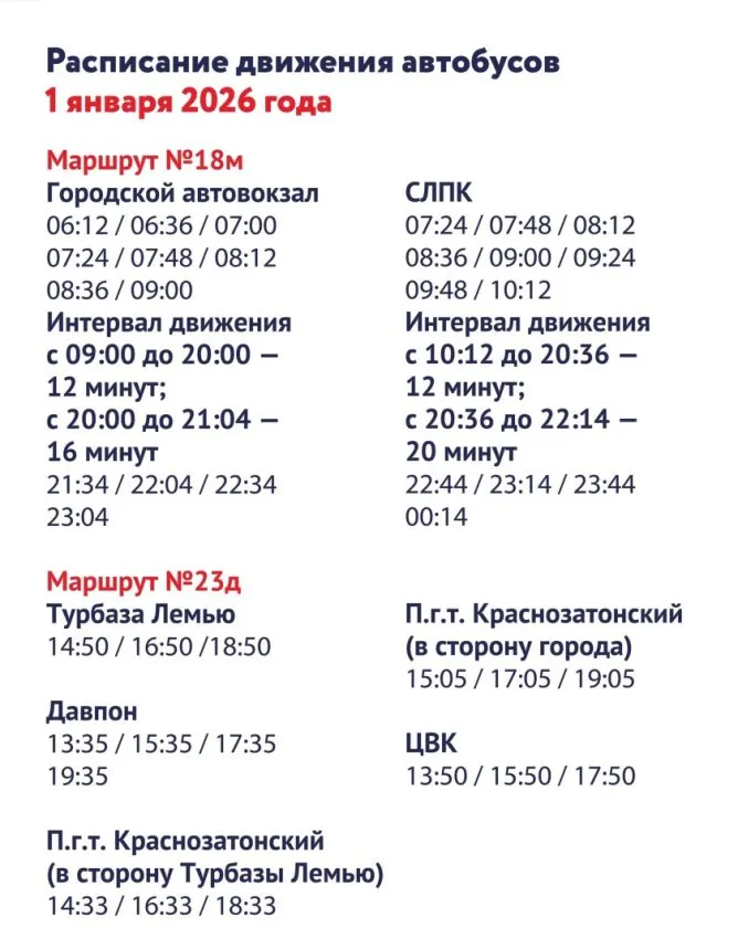 В канун Нового года большая часть городских маршрутов (№ 1м, 17м, 18м, 23, 23д, 25, 30, 36, 38, 54м) перейдет на график воскресного дня. Автобус №26 продолжит работу в обычном режиме. Корректировка затронет лишь маршрут №18м, где отменят два поздних рейса из Сыктывкара от автовокзала в 23:04 и от СЛПК в 00:14.