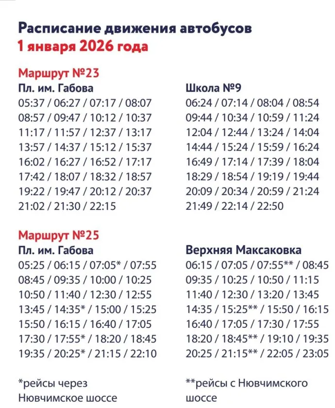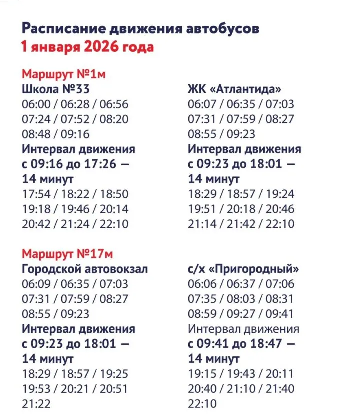 Со 2 по 11 января автобусы № 1м, 17м, 18м, 23, 23д, 25, 30, 38 и 54м будут курсировать по расписанию выходного дня. Работа маршрута №26 останется без изменений.