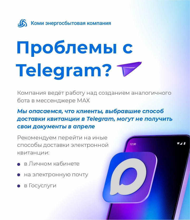 Квитанции Коми энергосбытовой компании могут не прийти в мессенджере Телеграм в апреле