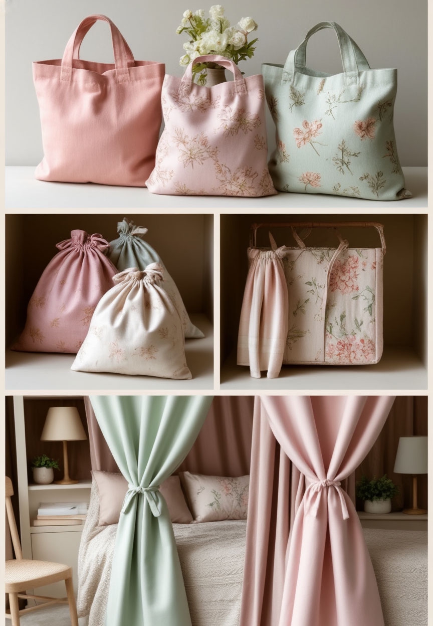 2. Функциональные мешки для систематизации Наиболее практичной идеей оказалось создание органайзеров для хранения. Из отрезов ткани получаются удобные мешки для обуви, чехлы для сезонной одежды или отдельные органайзеры для мелких вещей. Часто можно обойтись без шитья: достаточно сложить ткань в нужную форму и зафиксировать края декоративным шнуром. Этот подход позволяет быстро навести порядок в шкафу и поддерживать его.