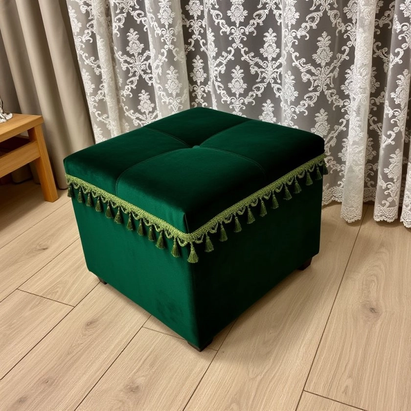Я предпочитаю не выбрасывать качественные ткани и предметы, особенно если они могут найти новое применение. В данном случае бархатная ткань оставалась привлекательной, и я использовала её, чтобы обтянуть старый пуф. Этот проект был реализован несколько лет назад.