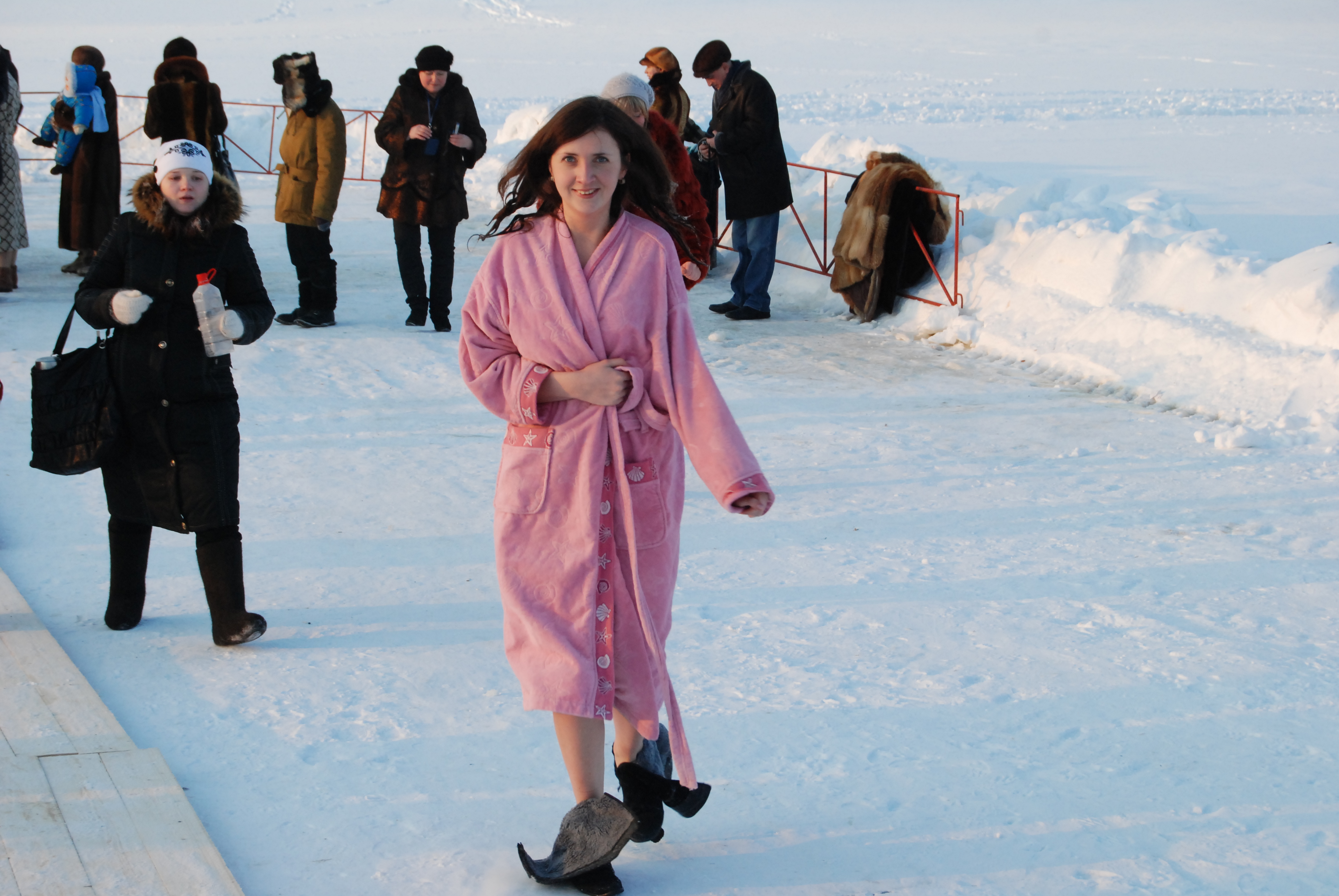 - Само купание лучше осуществлять не голышом, а в специальных длиннополых белых рубахах. Ну, если таковых не имеется, хотя бы в купальном костюме. Все-таки купаемся в освященной воде - надо относиться у этому с благоговением. Еще можно упомянуть, что традиция купания является околоцерковной, то есть ни в одной церковной книге нет строгих предписаний по этому поводу. Но в любом случае - это хорошая традиция: окунание в холодную воду - это небольшой подвиг преодоления себя ради Господа. Конечно же, стоит сходить в храм, помолиться, поприсутствовать при таинстве Водосвящения. Если будете окунаться, советую отдать предпочтение одежде, которую можно легко скинуть и быстро надеть. Окоченевшими пальцами не очень весело зашнуровывать ботинки, поэтому валенки и тулупы — самое подходящее одеяние, - рассказал отец Александр.