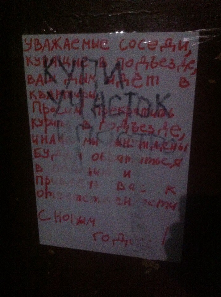 Первый ответ от курильщиков был написан на самом обращении, но предложение не было дописано: «Купи участок…». И вместо этого на двери появился подробный ответ: