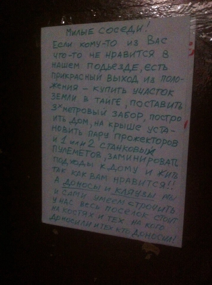 - Милые соседи! Если кому-то из Вас что-то не нравится в нашем подъезде, есть прекрасный выход из положения - купить участок земли в тайге, поставить 3-х метровый забор, дом, а на крыше установить пару прожекторов и станковые пулеметы, заминировать подходы к дому, и жить так, как вам нравится! А доносы и кляузы мы и сами умеем строчить. У нас весь поселок стоит на костях и тех, на кого доносили, и тех, кто доносил!