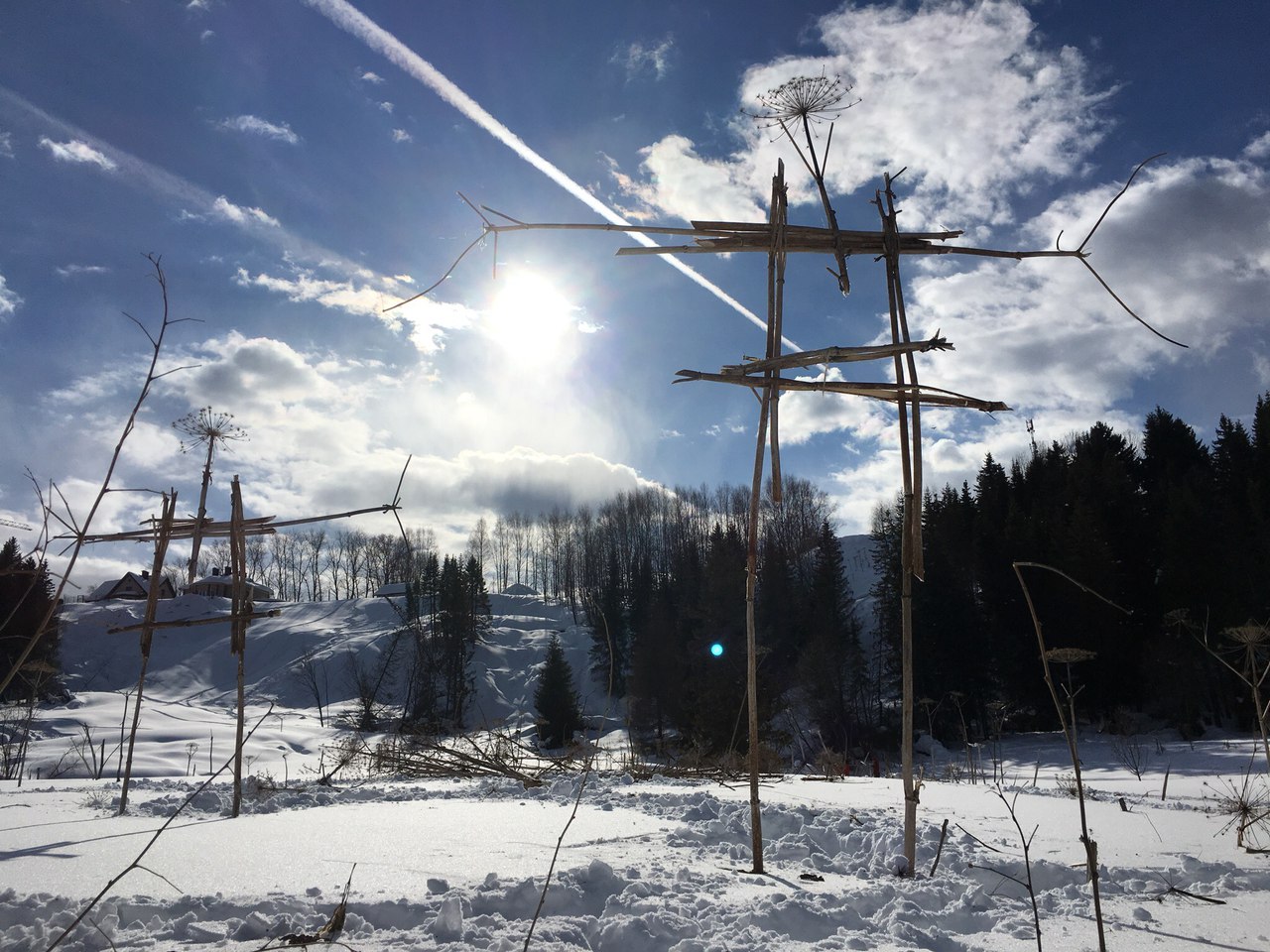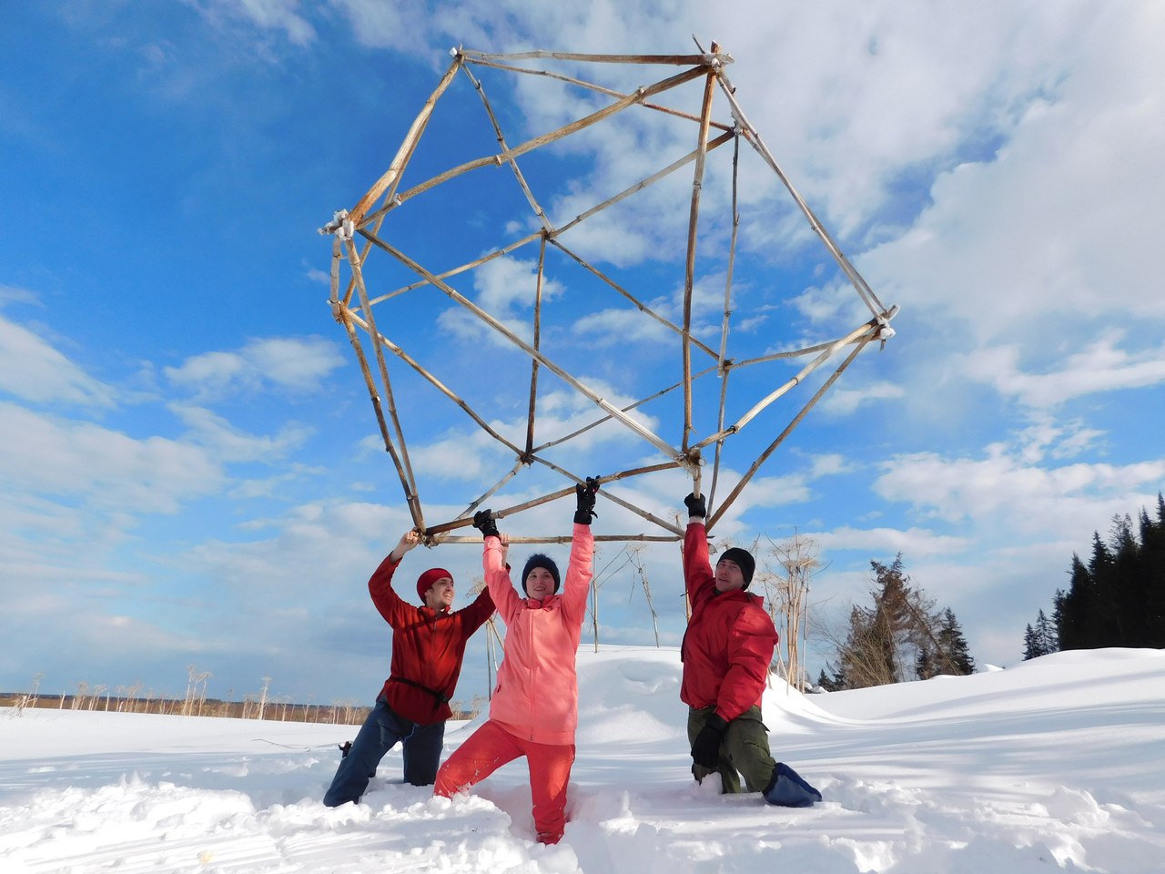 Как рассказал молодой человек ИА БНК, идея возникла спонтанно. И Стасу она настолько понравилась, что он предложил пятерым своим приятелям разделиться на две группы по три человека и смастерить что-нибудь из борщевика-сухостоя, который в изобилии встречается на левом берегу Вычегды. По итогам работы один творческий коллектив представил многогранник-икосаэдр, а другой - композицию из трех антропоморфных фигур.