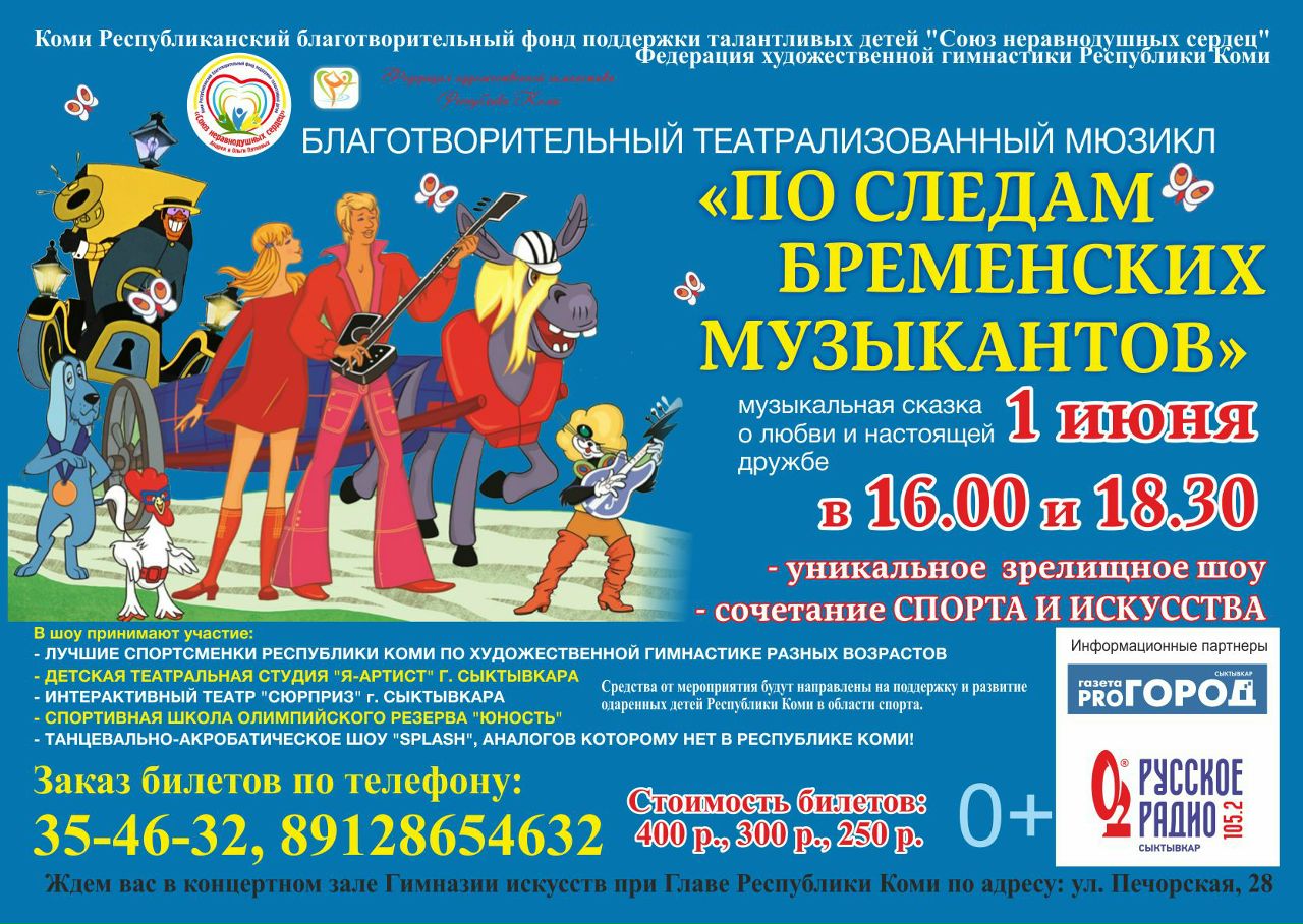 1 июня 2018 года в концертном зале гимназии искусств состоится благотворительное театрализованное представление «По следам бременских музыкантов», приуроченное к Международному дню защиты детей. Организаторы - Коми Республиканский благотворительный фонд «Союз неравнодушных сердец» совместно с Федерацией художественной гимнастики Республики Коми. Впервые на одной сцене в большом проекте примут участие представители спорта и искусства. Героями всем известной сказки станут как профессиональные, так и непрофессиональные актеры. Шоу-мюзикл объединит на сцене детей и взрослых.