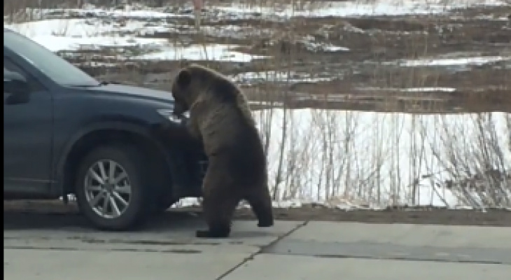 До этого медведя заметили на автосервисе, который находится рядом с лесополосой. Хищник подошел к машине и лапами облокотился на капот.