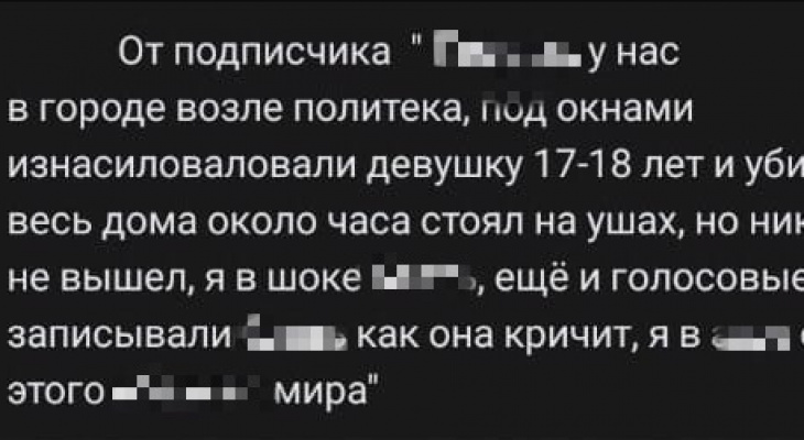 Сыктывкарцы в панике распространяют тревожные скриншоты в социальных сетях. В них сообщается, что якобы среди общежитий на Катаева какой-то маньяк изнасиловал и убил девушку. Но, похоже, это всего лишь очередная интернет-страшилка. Портал PG11.ru попытался разобраться в ситуации.