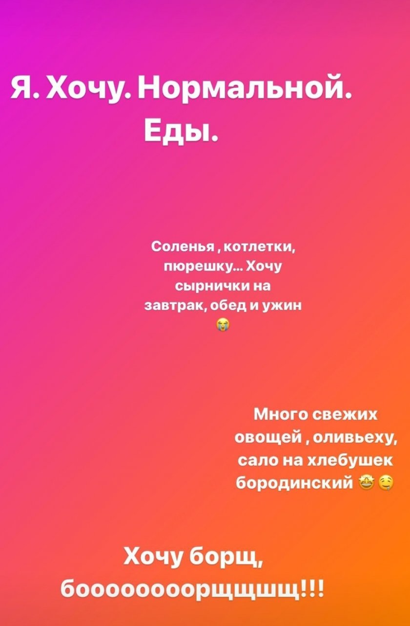 - Я хочу нормальной еды. Соленья, котлетки, пюрешку. Хочу сырнички на завтрак, обед и ужин. Много свежих овощей, оливьеху, сало на хлебушек бородинский. Хочу борщ! – написала лыжница в своем посте.