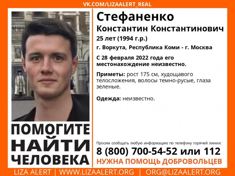 28 февраля в Москве пропал 25-летний Константин Стефаненко. Как выяснилось, парень родом из Воркуты, поэтому он может находиться в Коми. Об этом сообщает отряд "Лиза Алерт".