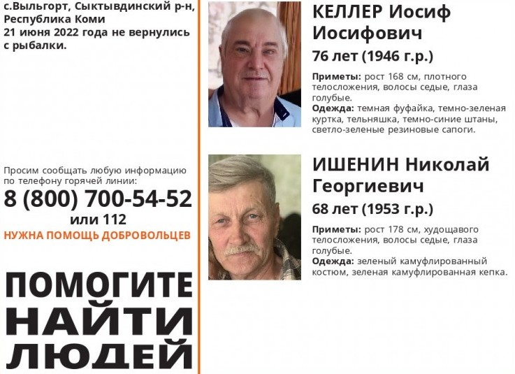76-летний Иосиф Келлер и 68-летний Николай Ишенин отправились на рыбалку, но так и не вернулись. Первый был одет в темно-зеленую куртку, фуфайку, тельняшку, темно-синие штаны и резиновые сапоги светло-зеленого цвета.