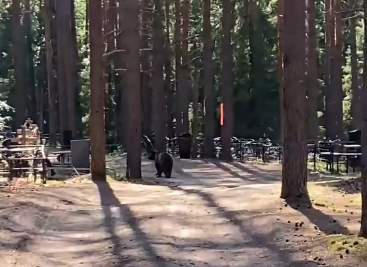 Очевидцы сообщили, что в этот раз косолапый решил перекусить в мусорном контейнере, а после отправился прогуляться по кладбищенским тропкам.
