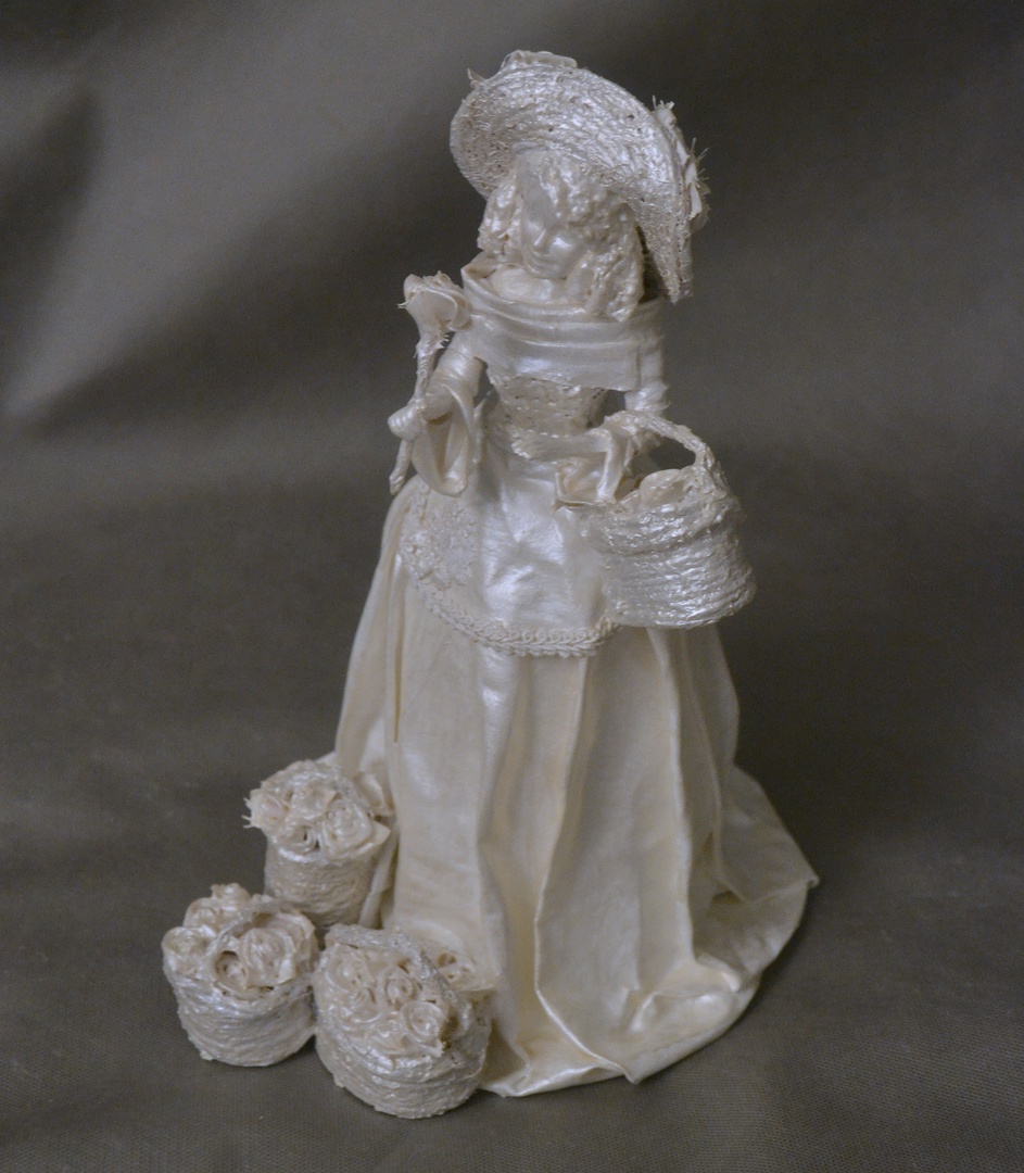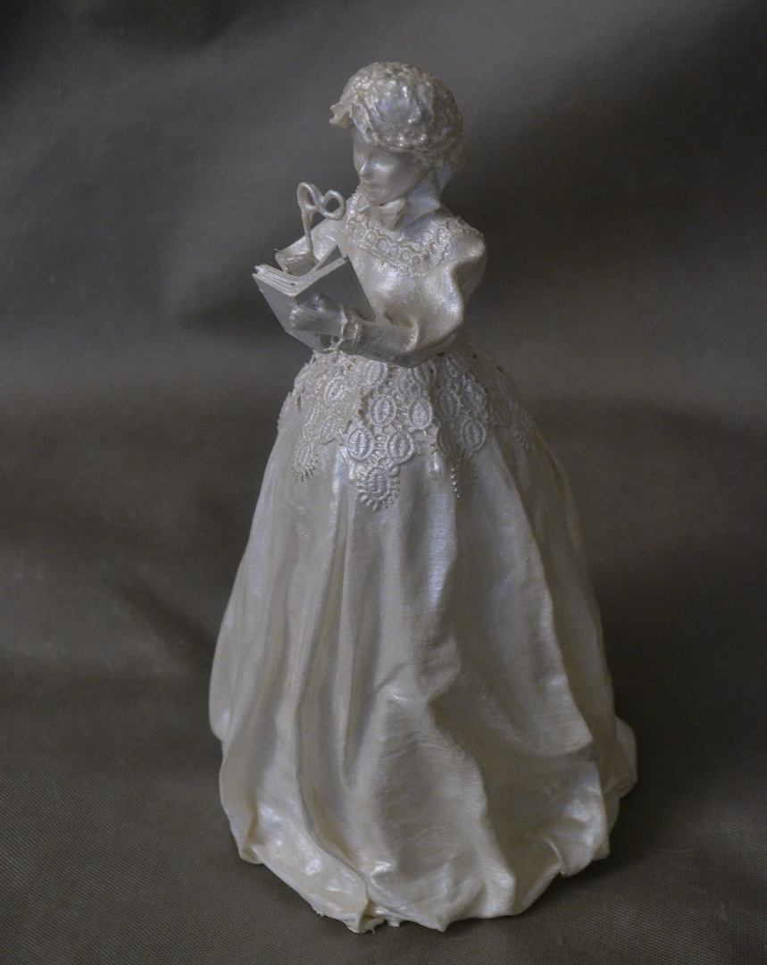 “Мне сперва понравилось делать картины в этой технике, потом я увидела, что можно изготавливать кукол. Мне пришла идея наряжать скульптуры в исторические платья. Голову я беру от куклы “барби”, а остальное все изготавливаю вручную. Все бетонируется на клее ПВА. Сама скульптура сохнет сутки, а потом я добавляю детали: рюши, кружево, пояса, шляпки, зонты. Волосы я изготавливаю из ваты, моделируя прическу с помощью пинцета. Изготовление очень кропотливое, еще и сохнет каждый слой долго. После высыхания я покрываю все краской, а потом перламутром в два слоя. На одну куклу уходит примерно одна неделя”, — поделился сыктывкарка.