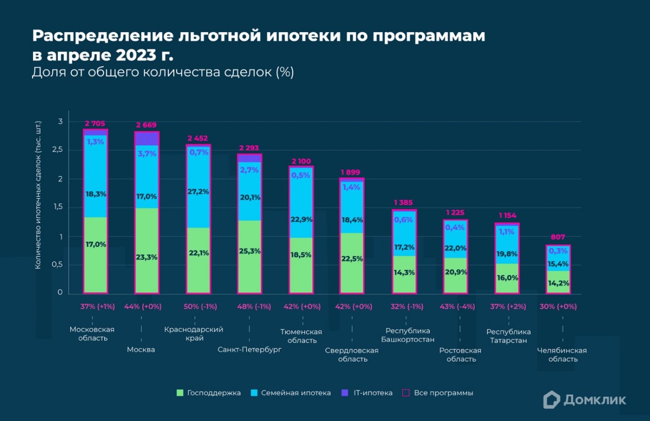 Количество выданных кредитов по льготным программам в апреле 2023 года (топ-10 регионов страны по количеству выдач). Количество сделок по программе «Господдержка» и доля выдач относительно общего количества ипотек за месяц показаны зелёным, количество сделок и доля выдач по «Семейной ипотеке» — синим, по «IT-ипотеке» — фиолетовым. Сделки по «Сельской ипотеке» и «Дальневосточной ипотеке» в данных регионах отсутствуют. Данные отсортированы по суммарному количеству сделок по всем льготным программам.