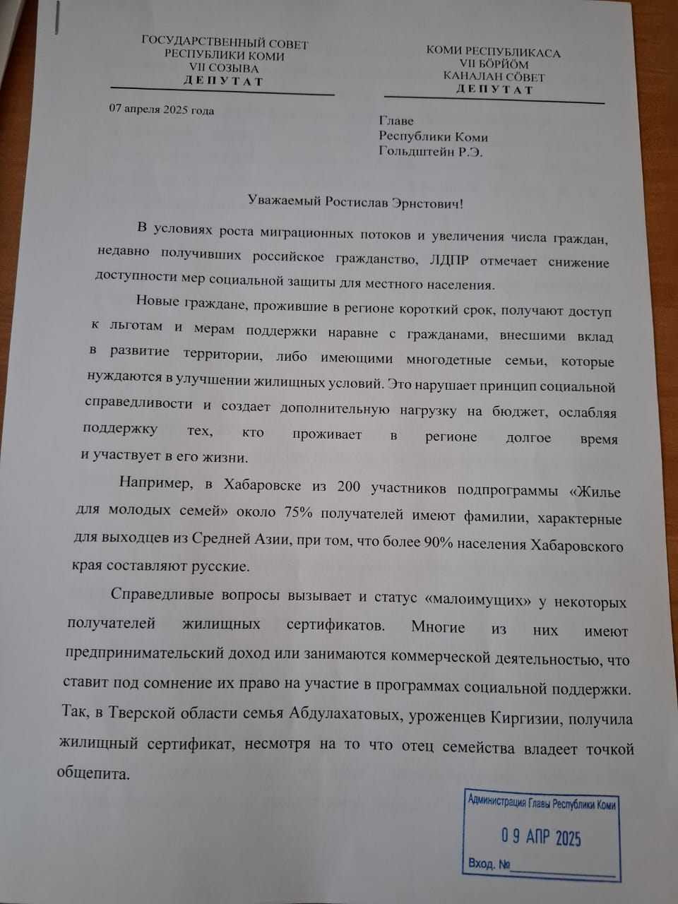 Депутат Государственного Совета Республики Коми от ЛДПР Наталия Зиновьева направила обращение к исполняющему обязанности Главы региона с предложением ввести дополнительные условия при предоставлении социальных мер поддержки лицам, недавно получившим гражданство Российской Федерации.