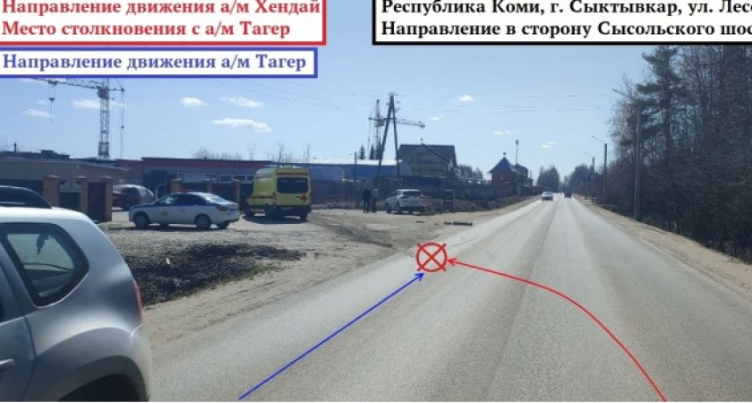 В Сыктывкаре в 09:35 утра водитель автомобиля Hyundai, двигаясь по Лесопарковой улице, при выполнении поворота налево проявил невнимательность и не удостоверился в безопасности совершаемого маневра, что привело к столкновению с автомобилем Tager.