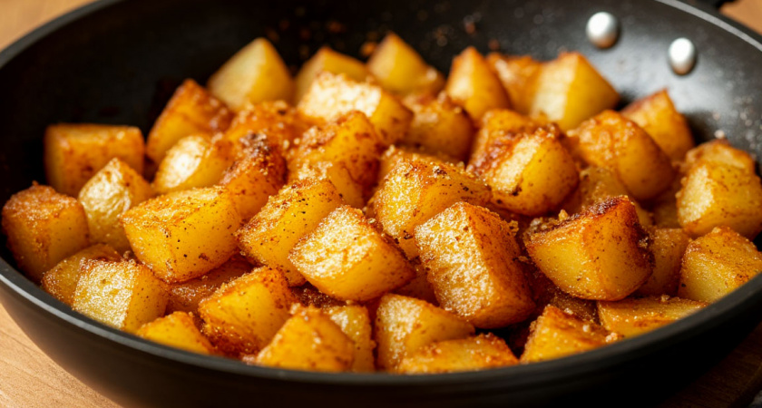Постоянное перемешивание мешает образованию румяной корочки. Лучше дать картошке жариться спокойно, без лишних движений, чтобы она равномерно подрумянилась.
